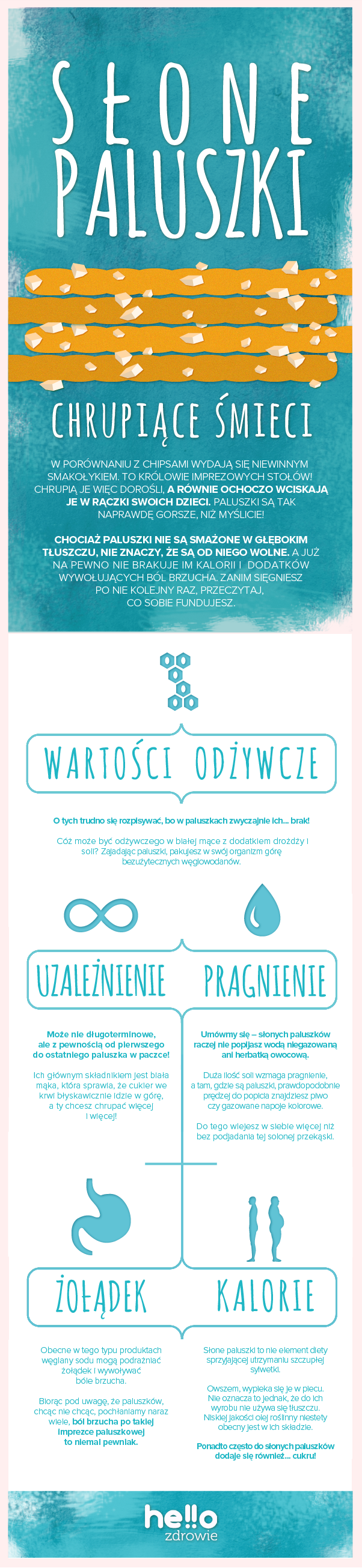 Głównym składnikiem paluszków jest oczyszczona mąka pszenna i przez to trudno w tej przekąsce dopatrzyć się składników odżywczych, które korzystnie wpływają na organizm. Duża ilość soli to kolejny dietetyczny minus spożywania paluszków – 100 g solonych paluszków dostarcza zwykle ponad 50% maksymalnego zalecanego dziennego spożycia tego składnika. A jeśli pragnienie wywołane nadmiarem soli gasimy piwem lub gazowanymi napojami, narażamy się dodatkowo na szybki skok glukozy i duży wyrzut insuliny – proces, który powtarzany często sprzyja rozwojowi insulinooporności i cukrzycy.